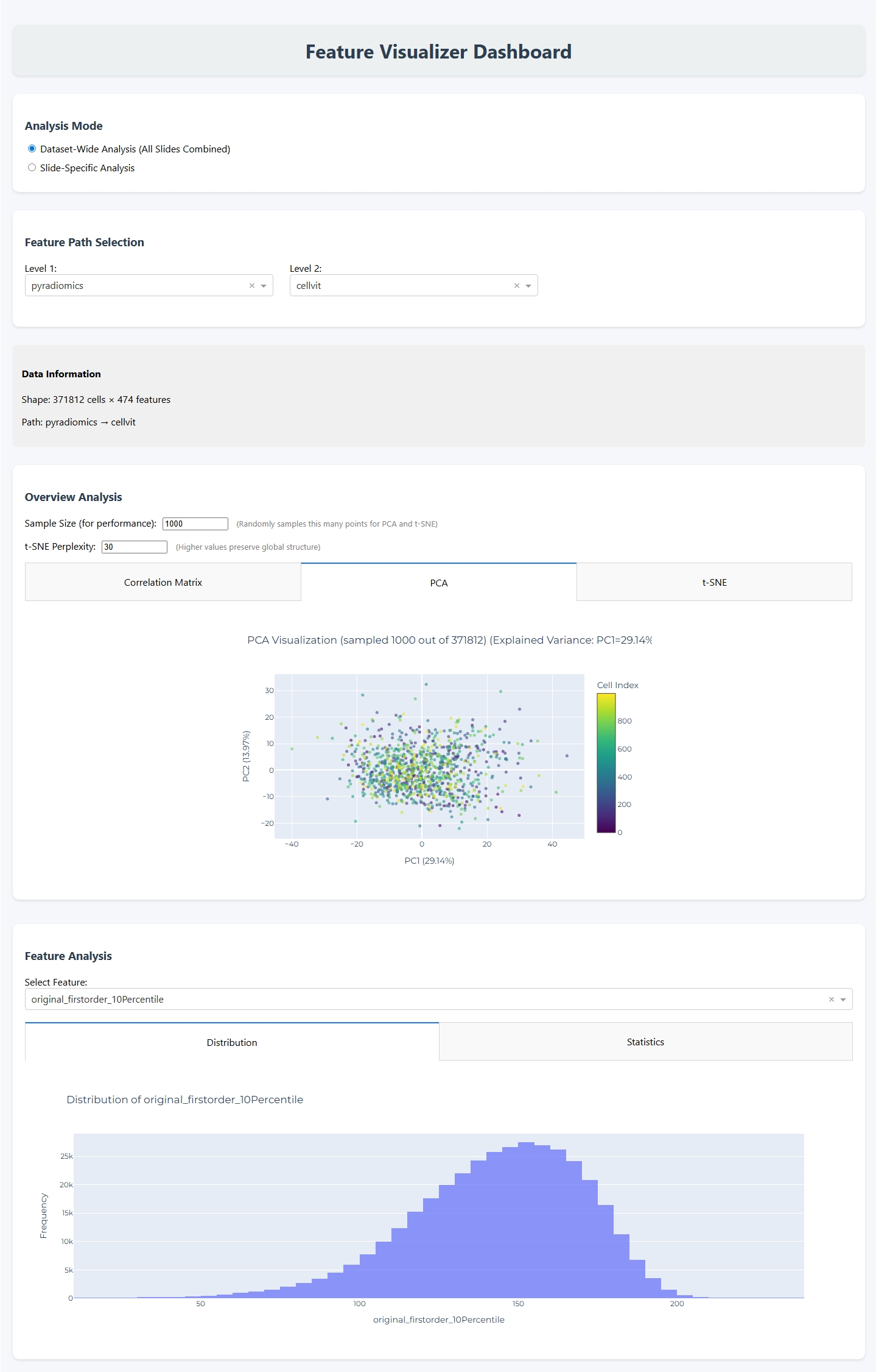 The feature visualization tool provides interactive visual analysis and statistical exploration of extracted features from your dataset. It enables comprehensive examination of feature distributions, correlations, dimensionality reduction, and cell-type-specific patterns through an interactive web interface.
